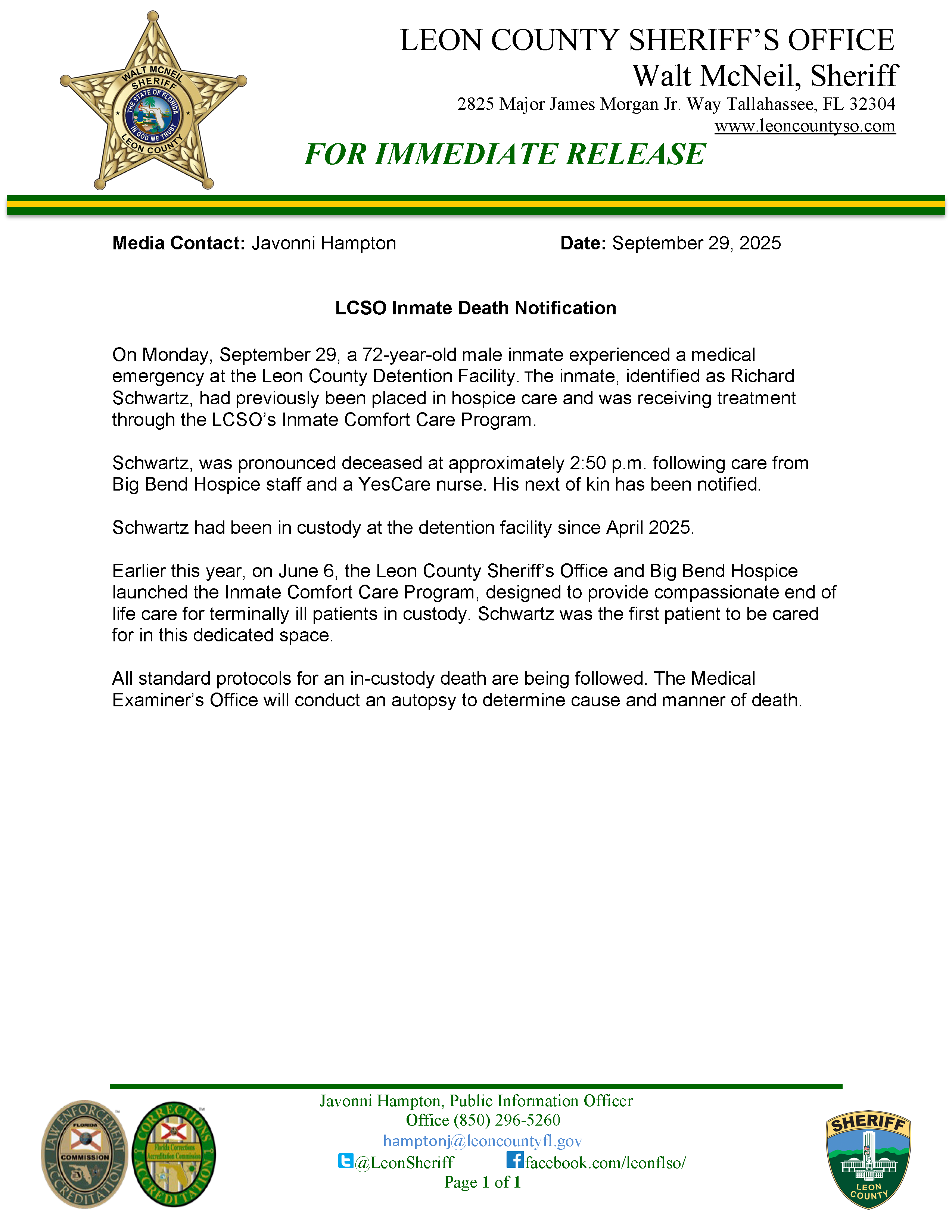 UPDATE: LCSO Inmate Death Notification
