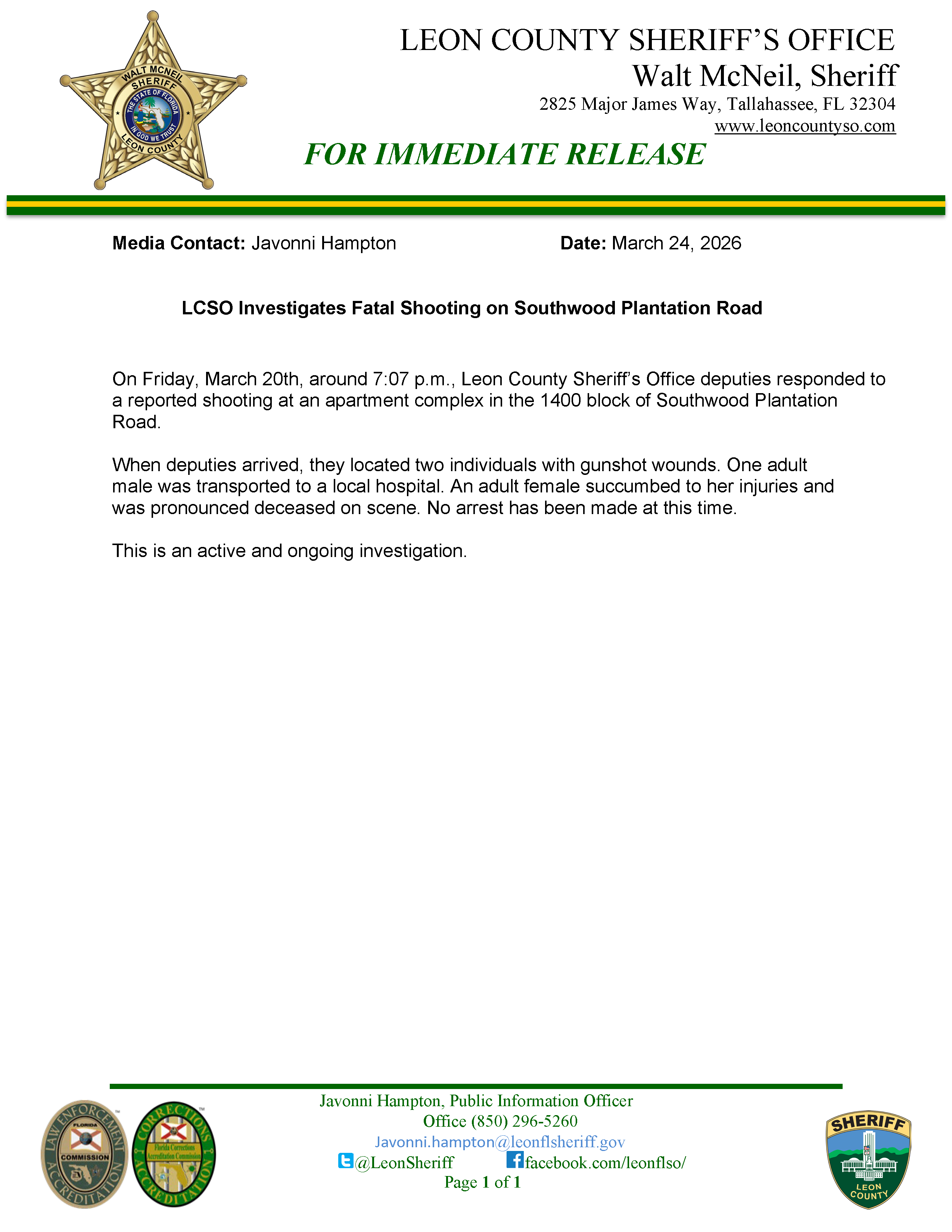 LCSO Investigates Fatal Shooting on Southwood Plantation Road